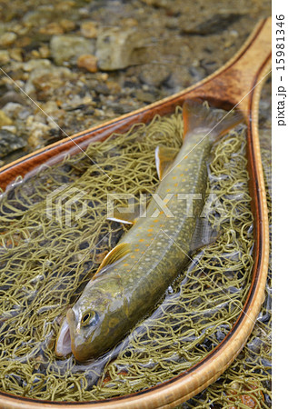 釣り ネットに横たわるアメマスの模様 大きい 雨鱒