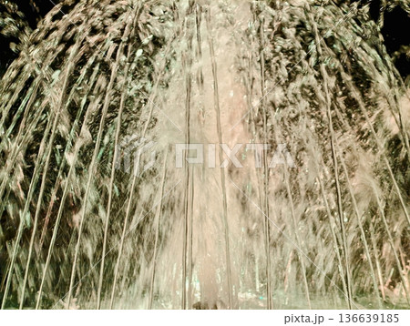 Vertical Water Display, Tall Vertical Water Column With Surrounding Arches And Spray Illuminated Warmly
