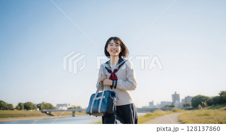 日本の女子高校生が自然の中や街中で笑顔で翔ける