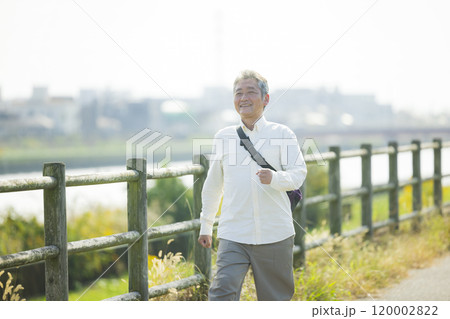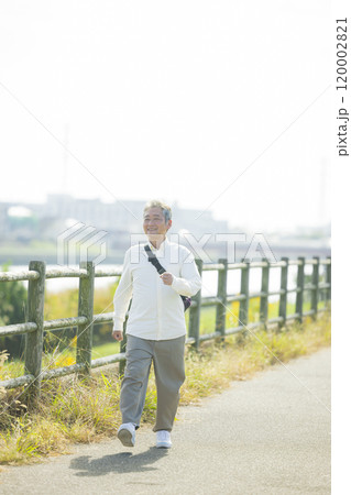 土手を元気にウォーキングするシニア