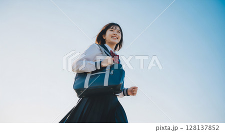 学生鞄を持って元気に走る女子学生のポップでカラフルなイラスト