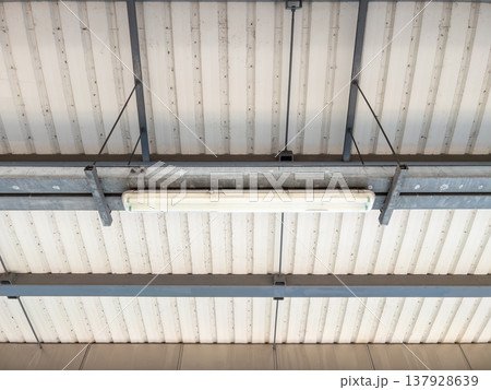 Fluorescent lamp installed on the industrial metal ceiling of the train station.