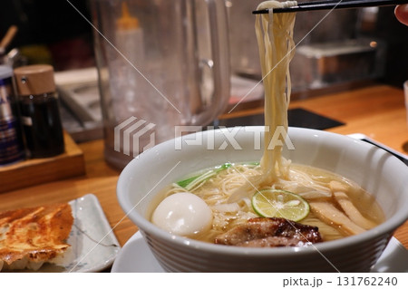 箸ですくいあげられた塩ラーメンの麺