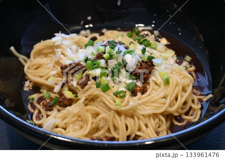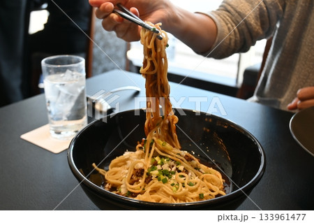 箸で持ち上げられた濃厚な汁なし担々麺