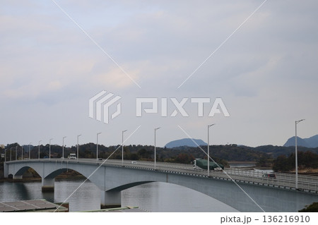 島根県側から眺める江島大橋の登坂路と自動車の往来 … 島根県 松江市(晴れ)