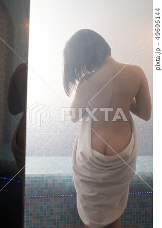 Brunette in the nude in sauna rearview