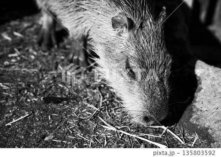 カピバラの顔アップ 草を食べる横顔 モノクロ写真