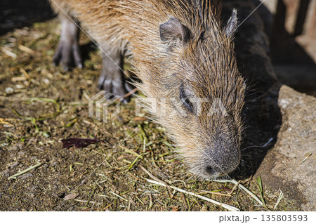 カピバラの顔アップ 草を食べる横顔 クローズアップ写真