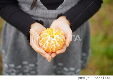 皮をむいたみかんを両手で持つ子ども 秋冬のやさしい食の時間
