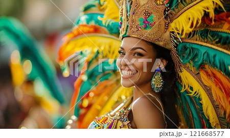 Brazilian samba dancer smiling with colorful feathers costume and jewelry