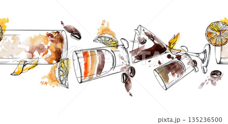 Seamless banner of espresso martini, B-52 layered creamy shots, Old-fashioned cocktail in tumbler crystal glass with orange zest peel. Hand painted in watercolor and ink for cafe, patisserie branding.