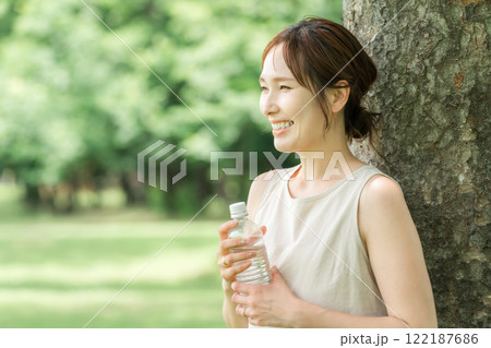 ペットボトルの水・ミネラルウォーター・白湯を飲むリラックスした女性