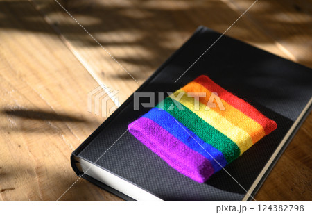 屋外で虹色のリストバンドをして散歩する男性カップル 顔無し