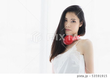 Portrait beautiful young asian woman use smart mobile phone listen music