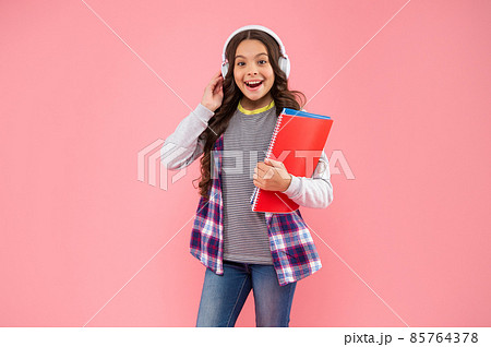 online education. back to school. amazed teen girl in headphones. listen to music.
