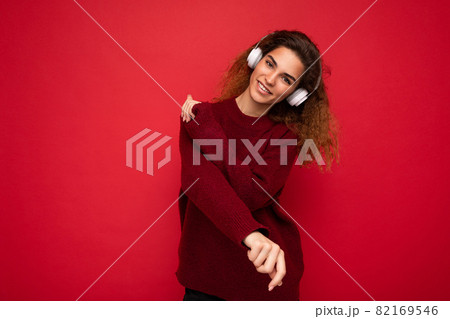 Beautiful happy smiling young brunette curly woman wearing dark red sweater isolated over red