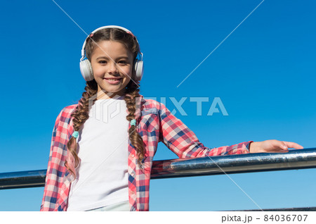 portrait of a beautiful charming young girl in a casual look with white headphones on a white