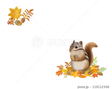 秋の落ち葉とどんぐりとリスの水彩イラスト かわいい小動物素材