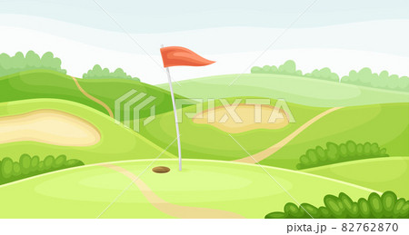 Countryside golf course with hole and red flag. Green summer beautiful landscape vector illustration