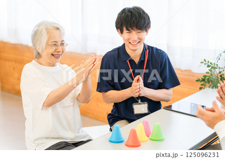 リハビリをするシニア男性と介護士,作業療法士の女性スタッフ