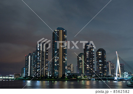 日本の東京都市景観 隅田川やリバーシティ21などを望む(夜景〉