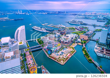日本の横浜都市景観2隻の豪華客船。桜木町駅や日本丸、大さん橋のリビエラ、ダイヤモンドなどを望む…