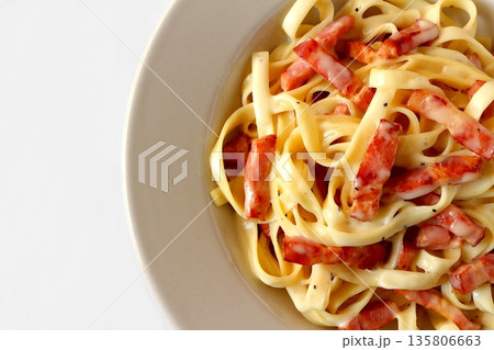 真上から見た白背景のタリアテッレのベーコンたっぷりのカルボナーラ