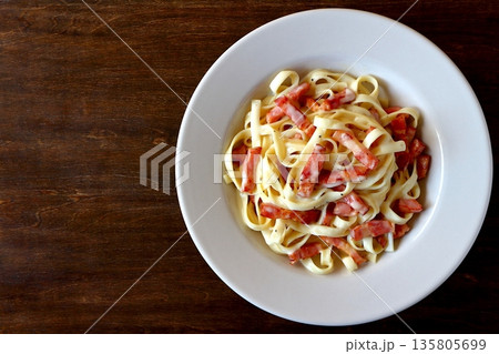 真上から見たタリアテッレのベーコンたっぷりのカルボナーラ
