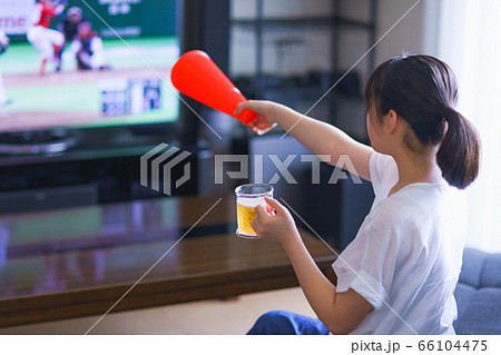 家でビール片手に推しを応援する若い女性のイメージ