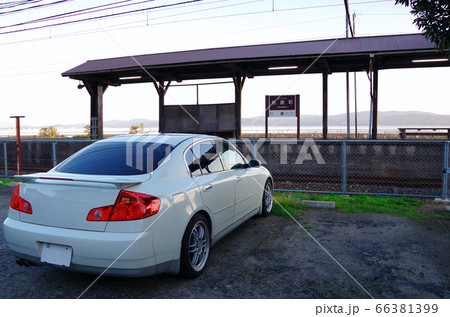線路沿いの駐車場から眺める夕暮れの宍道湖と一畑電車のレトロな駅の風景 … 島根県 松江市(快晴)