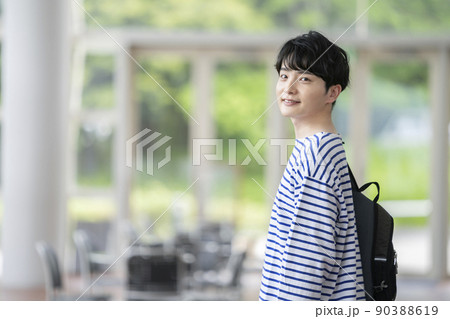 バックパックを持ったカメラ目線で笑顔の若い男性