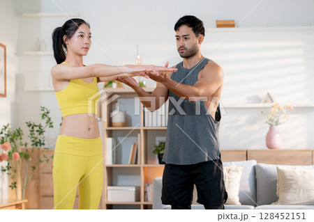 Fitness coach guidance with asian woman during squat training at home in living room.