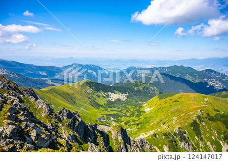 A hiker journeys through the lush green valleys of Low Tatras National Park in Slovakia, surrounded by stunning mountain scenery and clear blue skies on a bright sunny day.