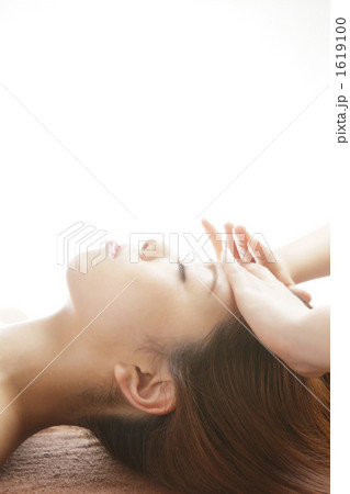 ヘッドマッサージを受ける若い女性とセラピスト ドライヘッドスパ エステサロン イメージ