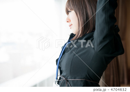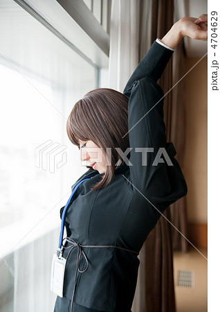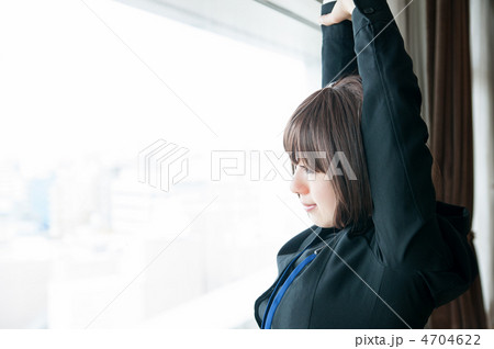 窓の向こうを見つめながらストレッチするビジネスウーマン