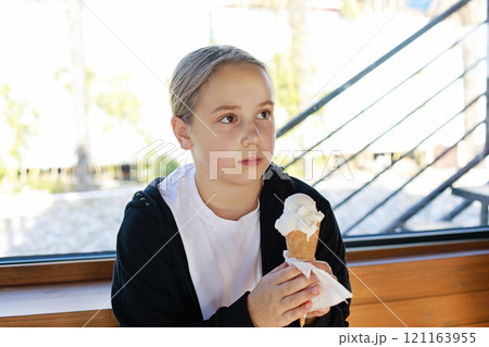 Close-up of a young girl enjoying marshmallows from her hot cacao in a cozy cafe on a chilly winter day