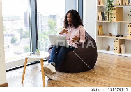 Young adult woman sitting on beanbag engaging in video call session using laptop in bright, well-lit interior with organized bookshelves and wooden floor, conveying productivity and comfort