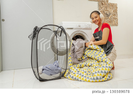 A Happy Woman Joyfully Doing Laundry at Home with a Washing Machine and Basket