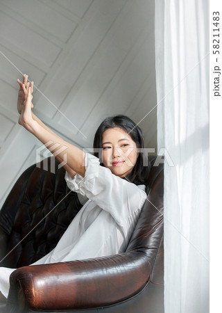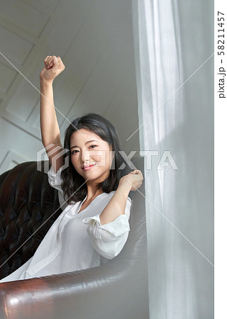 リラックスする働く若い女性 ビジネスウーマン コーヒーブレイク