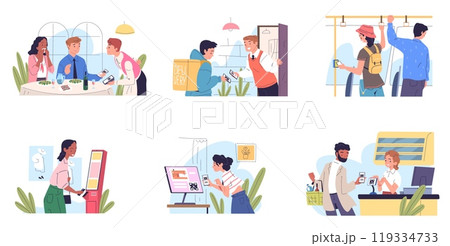 People pos payment. Customer paying ringing purchase order cashless terminal cashier counter retail checkout cafe smartphone nfc electronic pay system, classy vector illustration