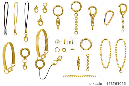 キーホルダーとストラップパーツセット/金具、リール、松葉紐、ナスカンのベクターイラスト素材集gold