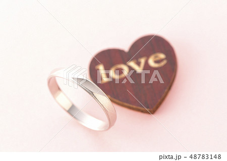 wedding bouquet of white and red roses, gold wedding rings on a brown wooden table