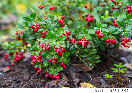 Lingonberry vaccinium vitis-idaea, cluster, paths