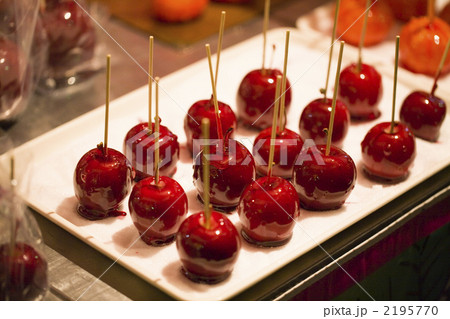 カラフルな飴 りんご飴 屋台 夏休み グルメ 果物 串刺し お祭り