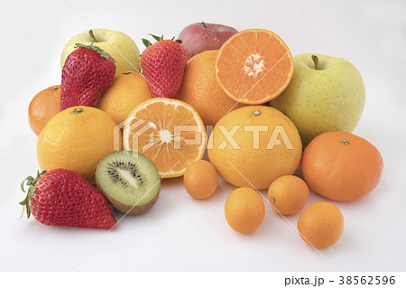 夏っぽい光で色々なフルーツと白玉が入ったフルーツポンチを白背景で撮影
