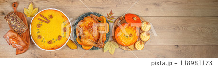 Thanksgiving dinner. roasted whole chicken or turkey, pumpkin pie and soup. traditional festive food on wooden table