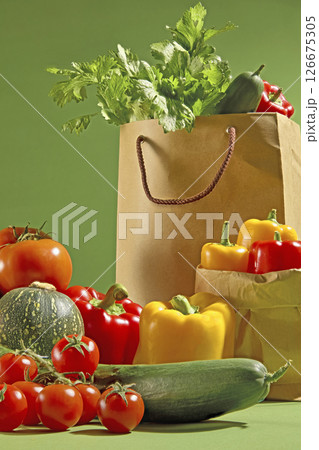 A brown grocery bag filled with fresh vegetables like broccoli, zucchini, and bell peppers on a green background. Tomatoes are spread around the base in an organic layout.