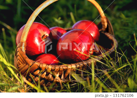basket with apples in the grass, evening sun backlight, end of summer beginning of autumn