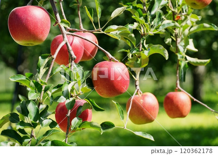 果樹園の緑を背景に日差しを浴びて赤く色づいたリンゴの果実 Ver1