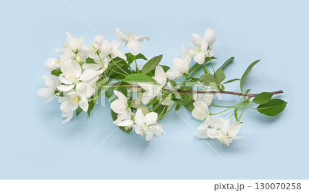 Tender branch with pink bloom of young crabapple tree with green foliage in early spring.